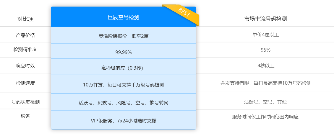 10万并发处理能力,千万级别号码检测,0.3秒响应时间,为您的业务提速增效